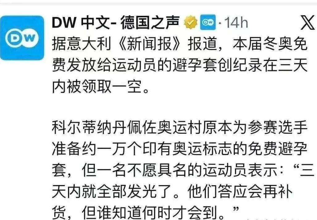 米兰冬奥会刚开赛三天,据说组委会准备的一万只避孕套就被一扫而空,这速度直接刷新了奥运纪录,让网友直呼年轻运动员的荷尔蒙太旺盛了,可以想象组委会都汗流浃背了!