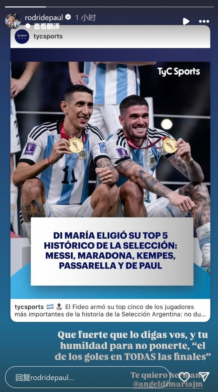 德保罗社媒转发了迪马利亚的采访内容,并配文:“你这么说真的令人惊讶,而且你谦逊地没有将自己列入其中,尽管你是‘在所有决赛中进球的人。’爱你,兄弟。”